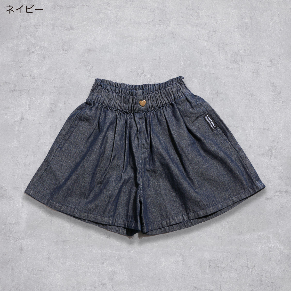 薄手のライトオンデニムを使用しており、軽やかな着心地です。 ウエストはゴム仕様で、簡単に着脱出来るため、忙しい朝の準備もスムーズです。 両サイドにポケットが付いているのも嬉しいポイントです。 ウエストには飾りハート釦がついておりトップスをインしたスタイリングもおすすめです。