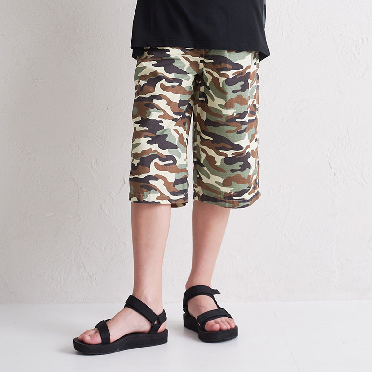 綿100%のリップストップ素材の迷彩柄ハーフパンツ。 ウエストゴムで着脱しやすく普段使いにおすすめです。 前に2つ、後に1つポケット付き。