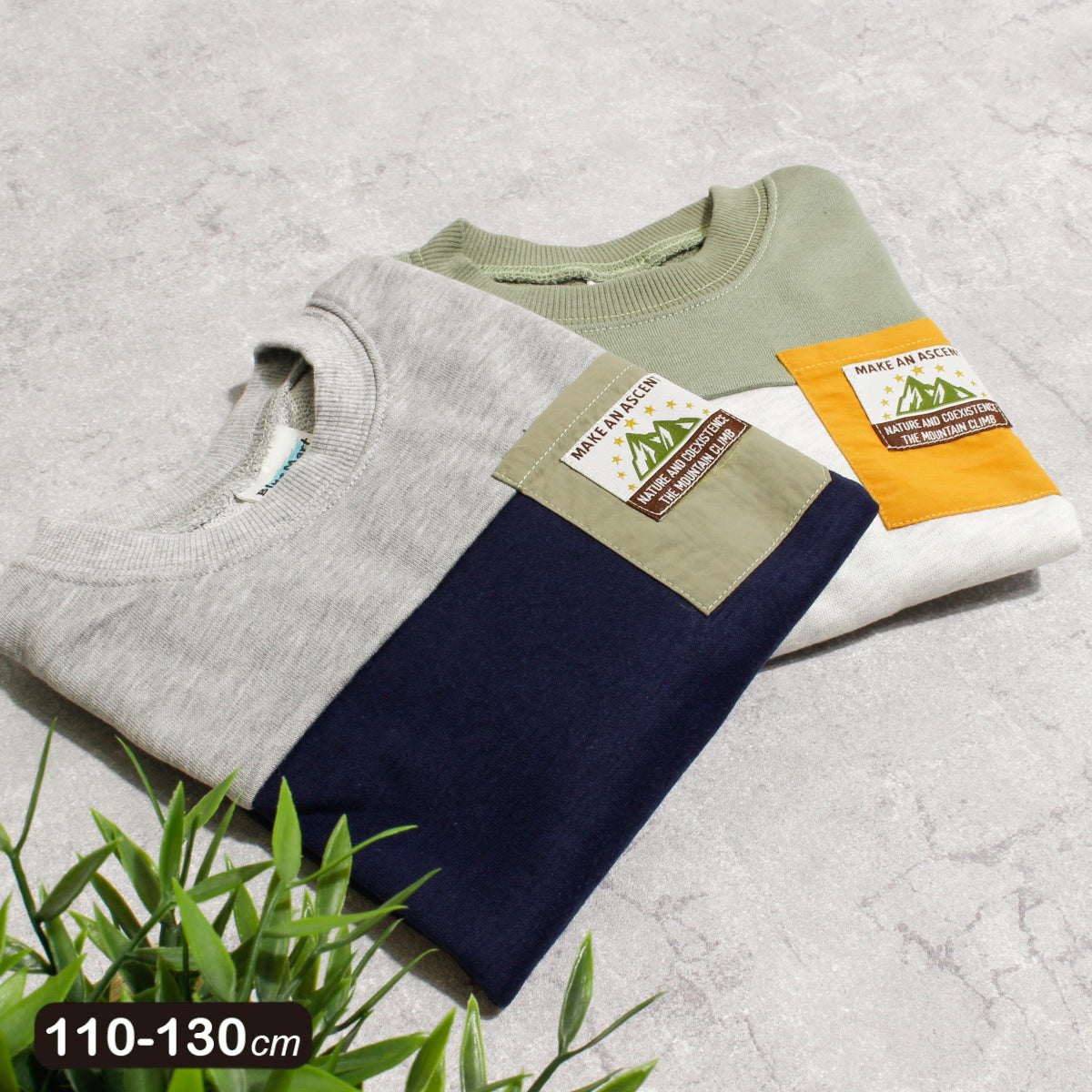 裏毛素材(起毛なし)のトレーナー。落ち着いたカラーリングと切り替えデザインが、さりげないおしゃれを演出します。 胸元にはポケットと、アウトドアテイストの織りネームをプラス。 背中には英字ロゴが入っており、後ろ姿もかっこよく決まります。 普段使いはもちろん、公園やアウトドアなどのアクティブシーンにもぴったりな一枚です。