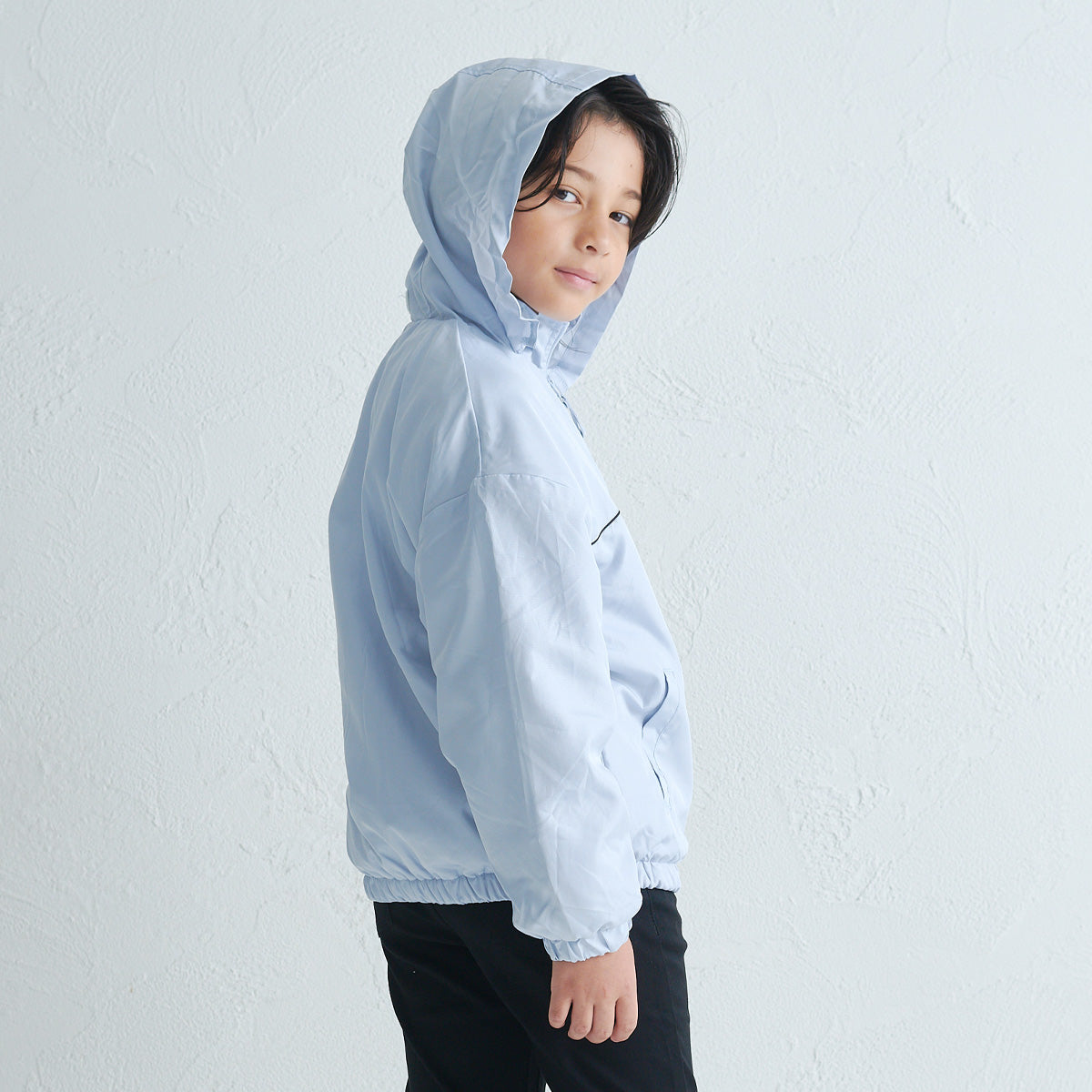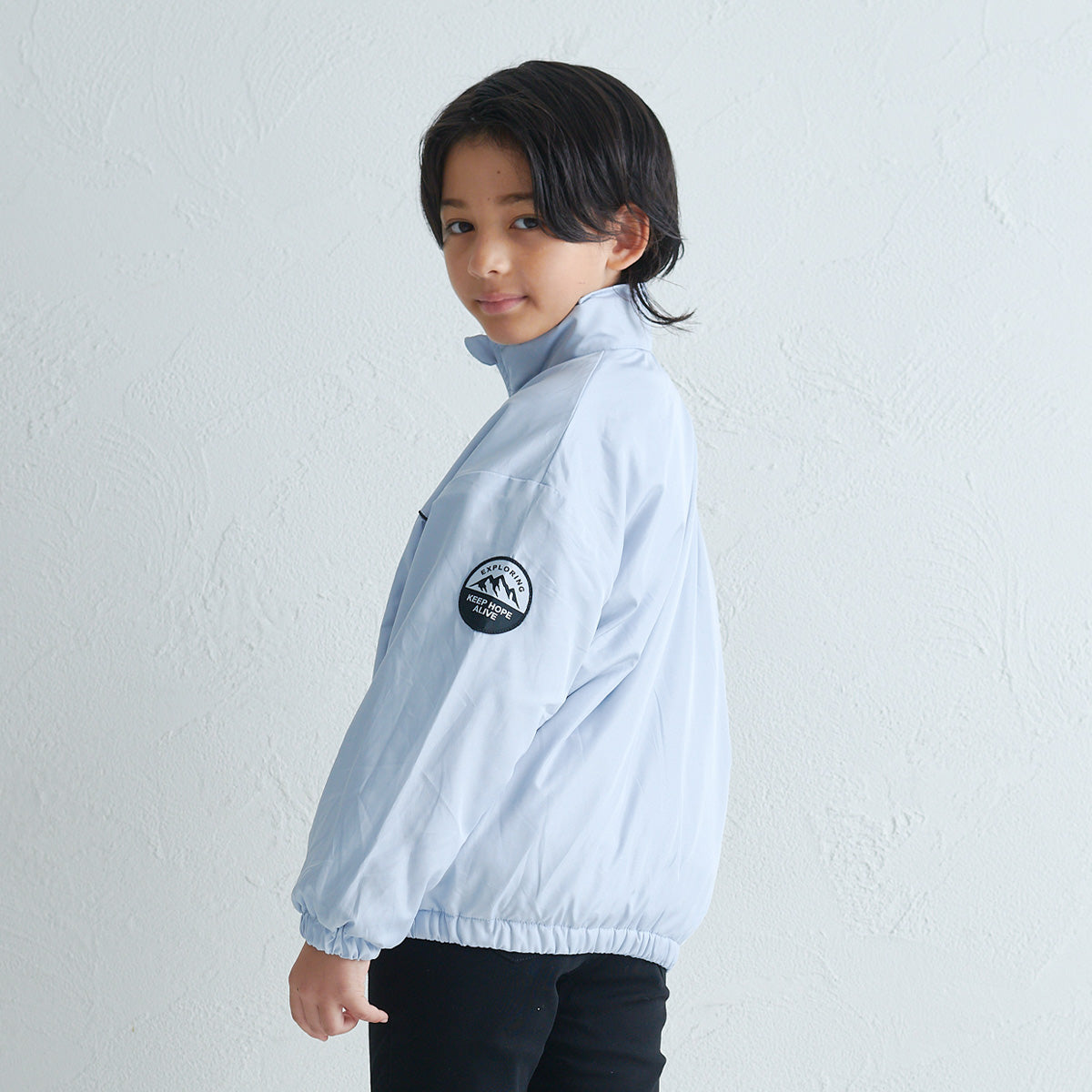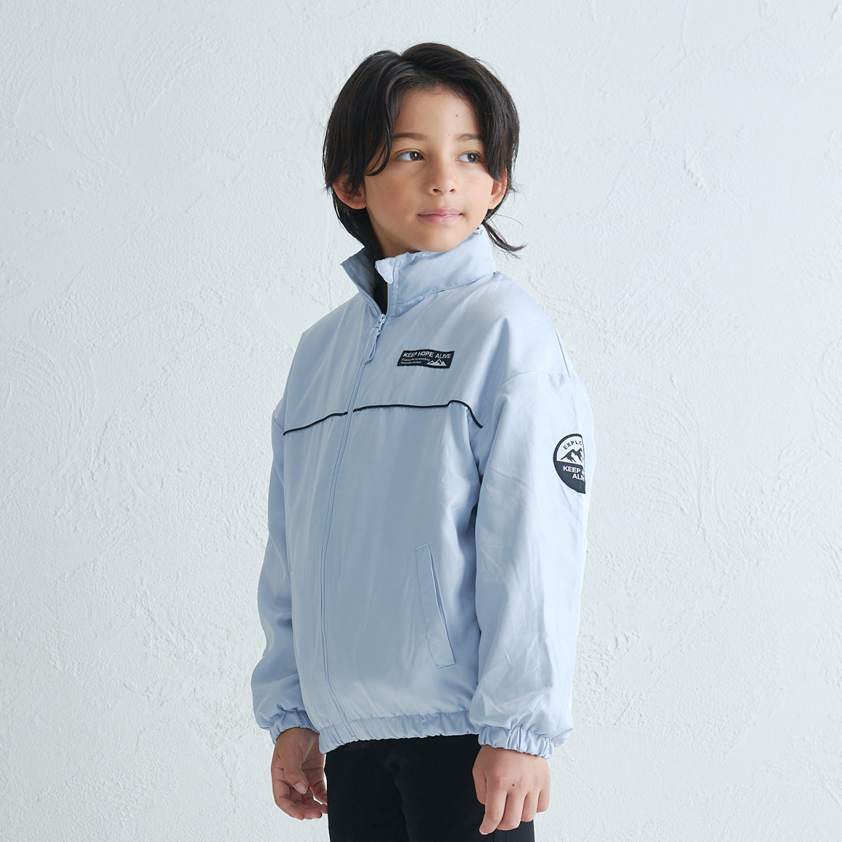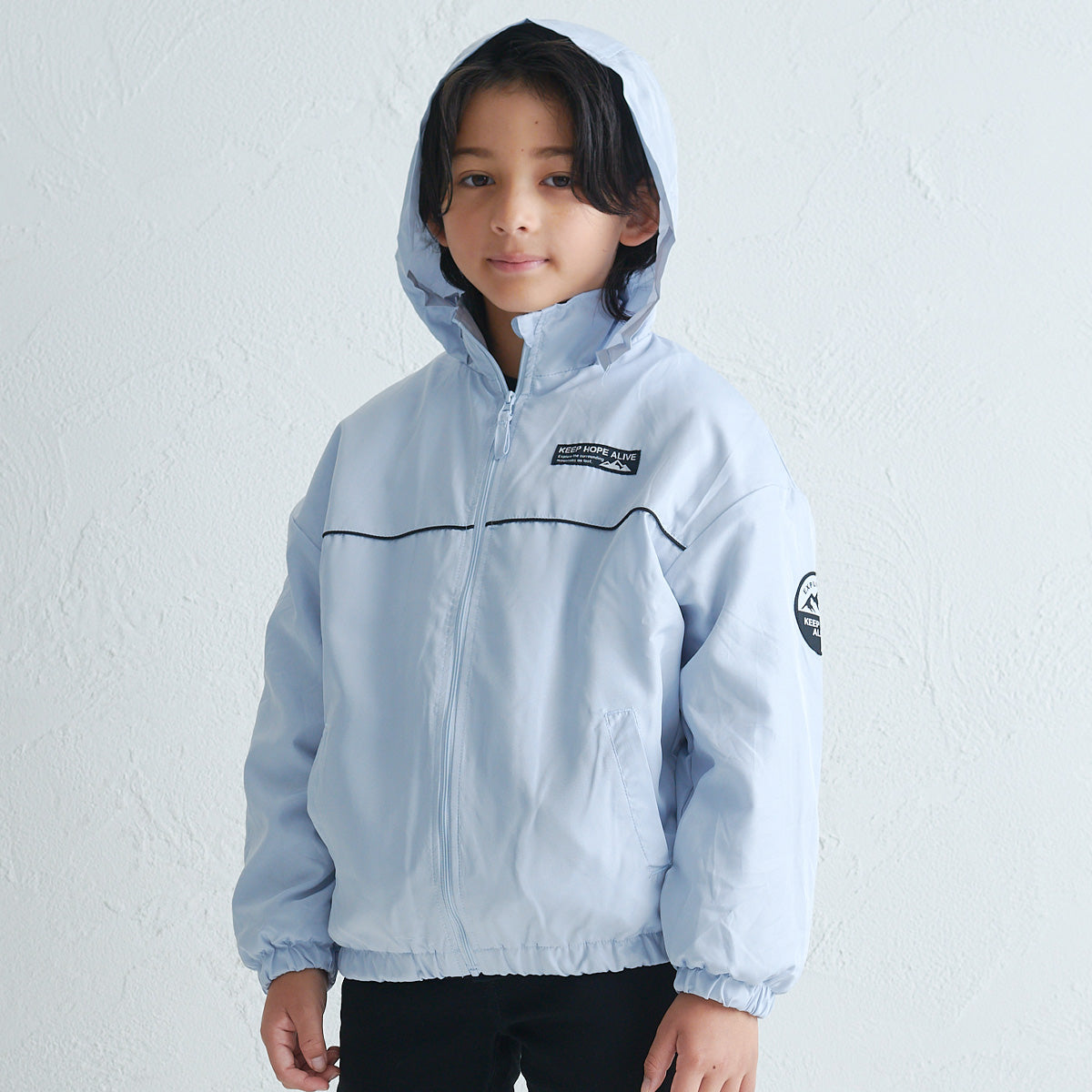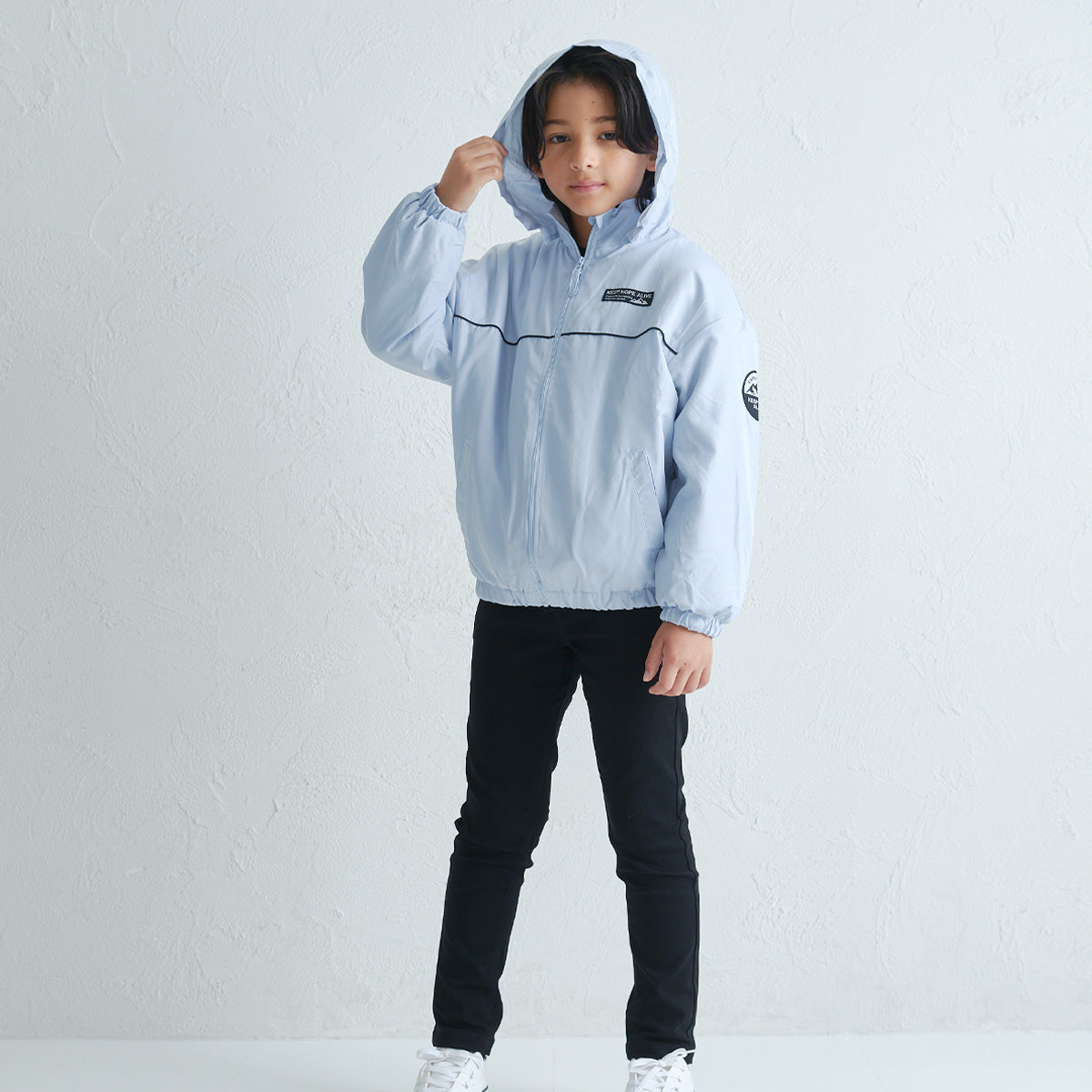 裏地にフリース素材を使用した軽量のジャケットです。 胸元のロゴや、袖のワッペンがさりげないアクセントに。 左脇にはリフレクター付きで、安全面にも配慮しています。 フードは襟元にしまえるインフード仕様で、スタイルに合わせて使い分けができるのも嬉しいポイント。 デイリーに使いやすい1枚です。