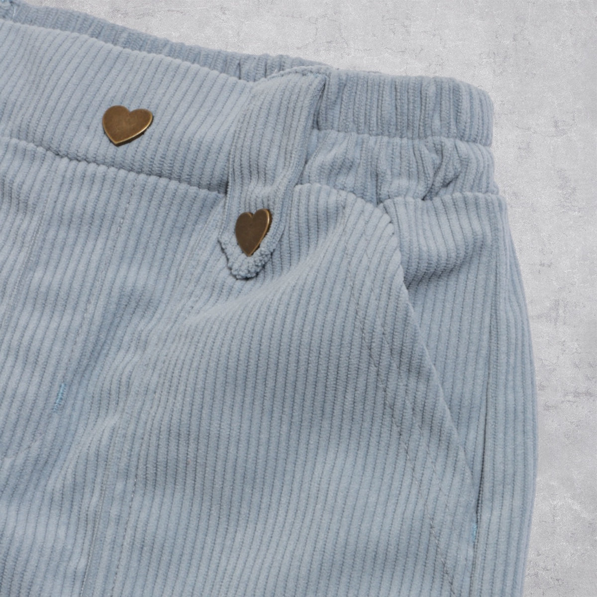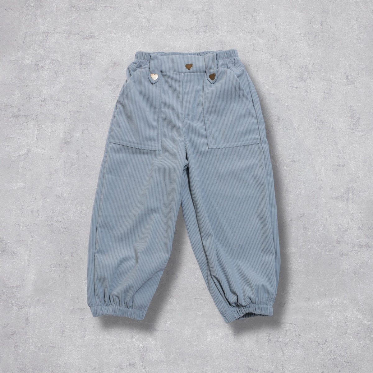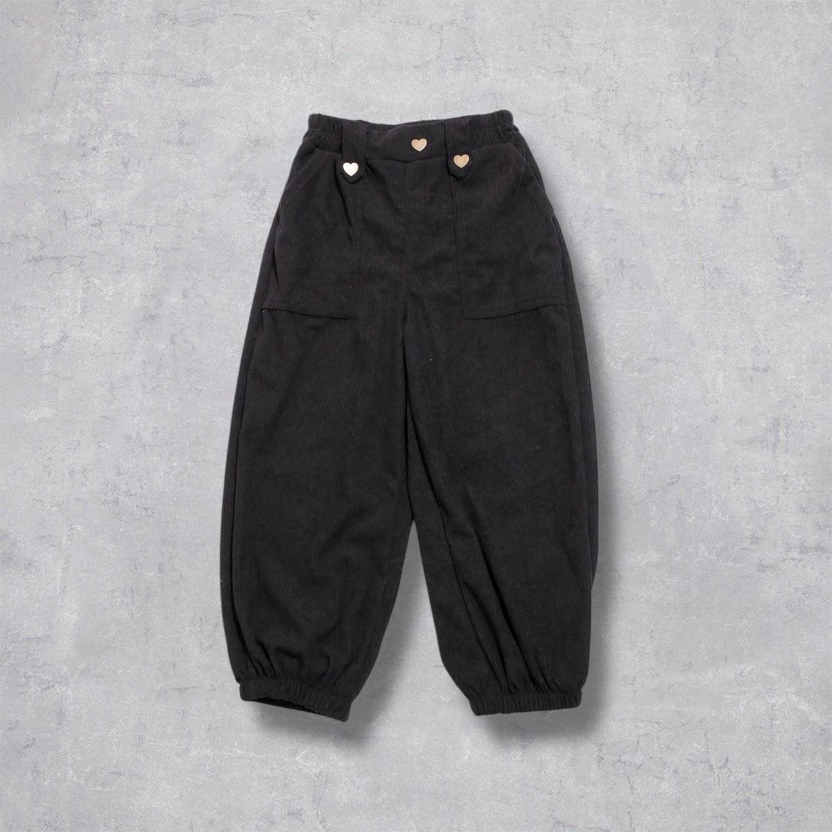 トレンドのワイドシルエットに、ちいさなハートの飾りボタンがきらり。秋冬らしいコーデュロイ素材のパンツ。