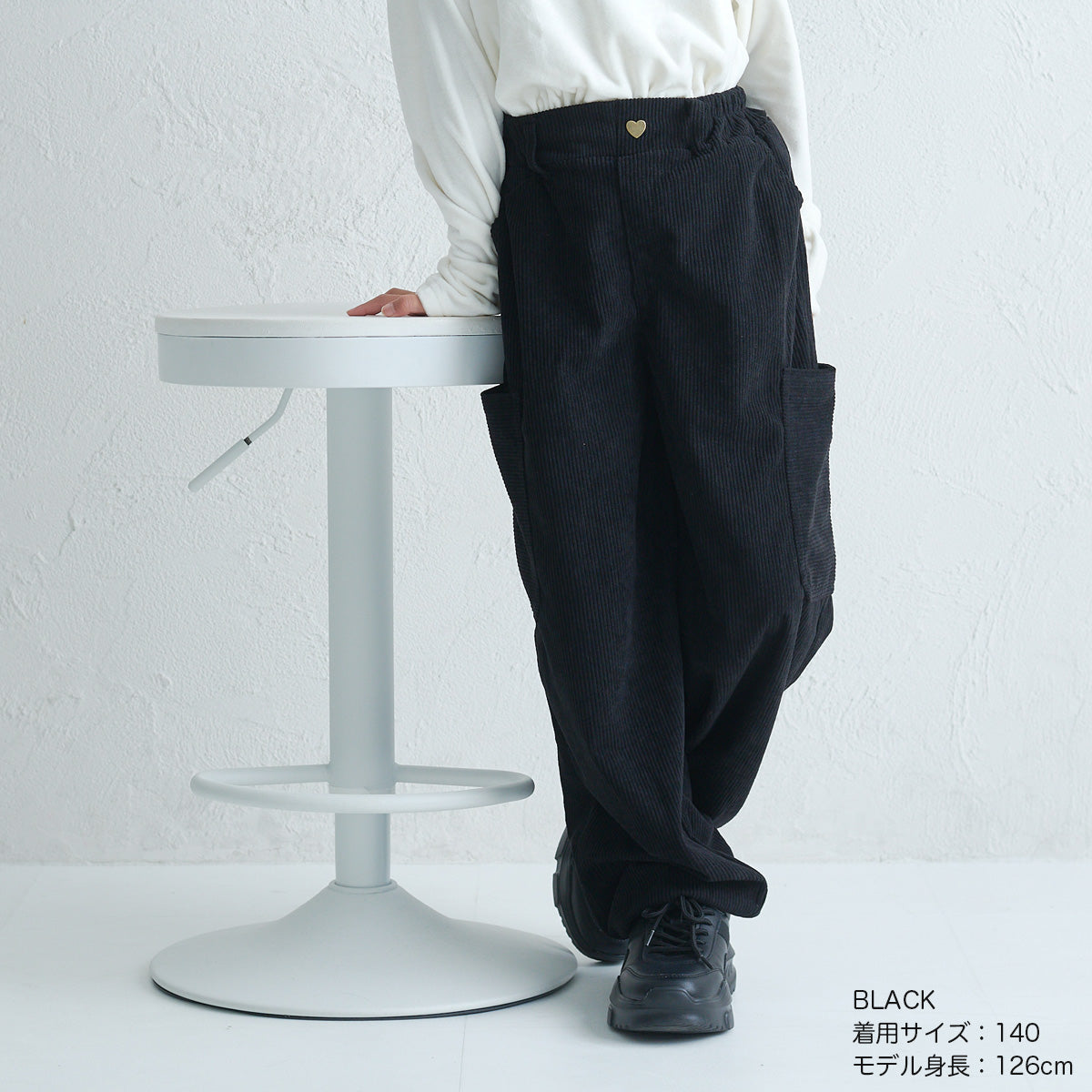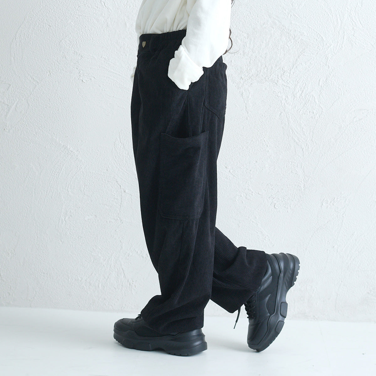 トレンドのワイドシルエットに、ちいさなハートの飾りボタンがきらり。秋冬らしいコーデュロイ素材のパンツ。
