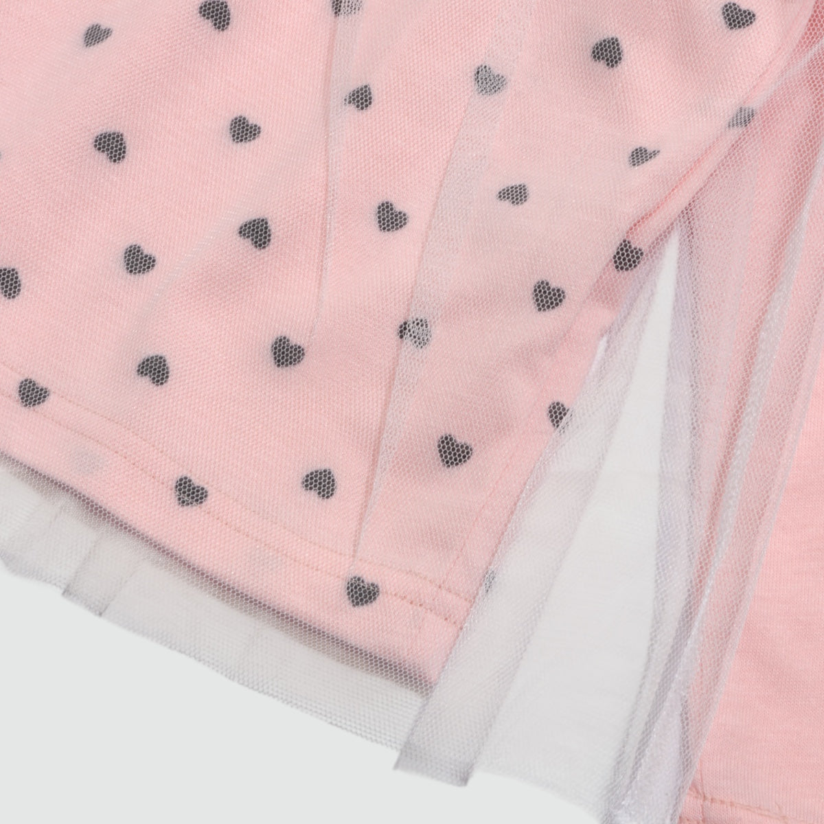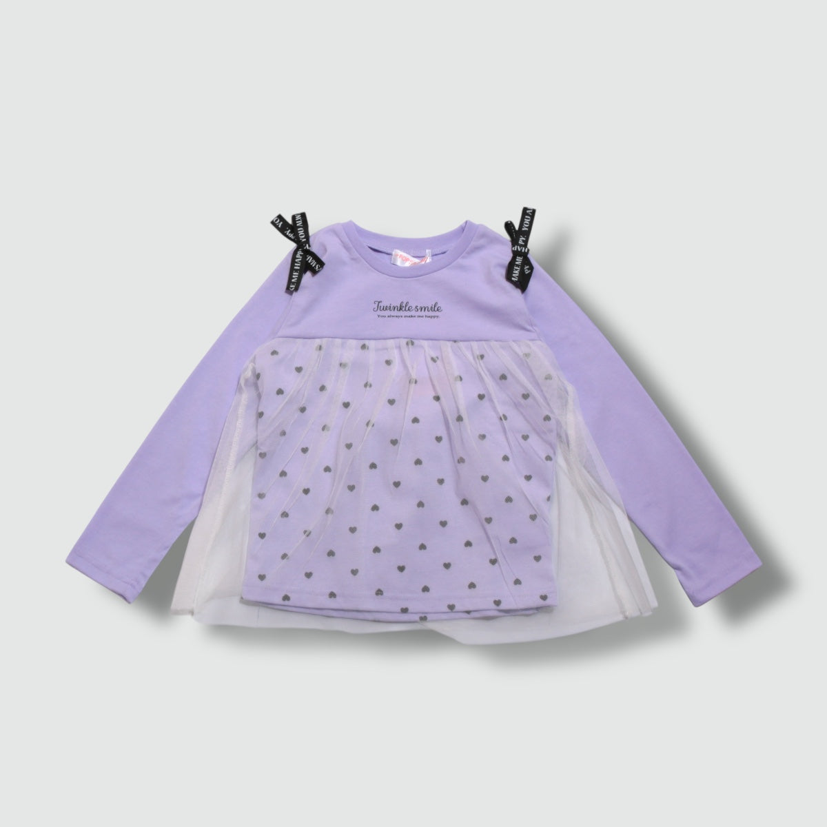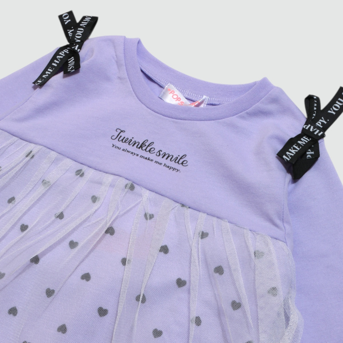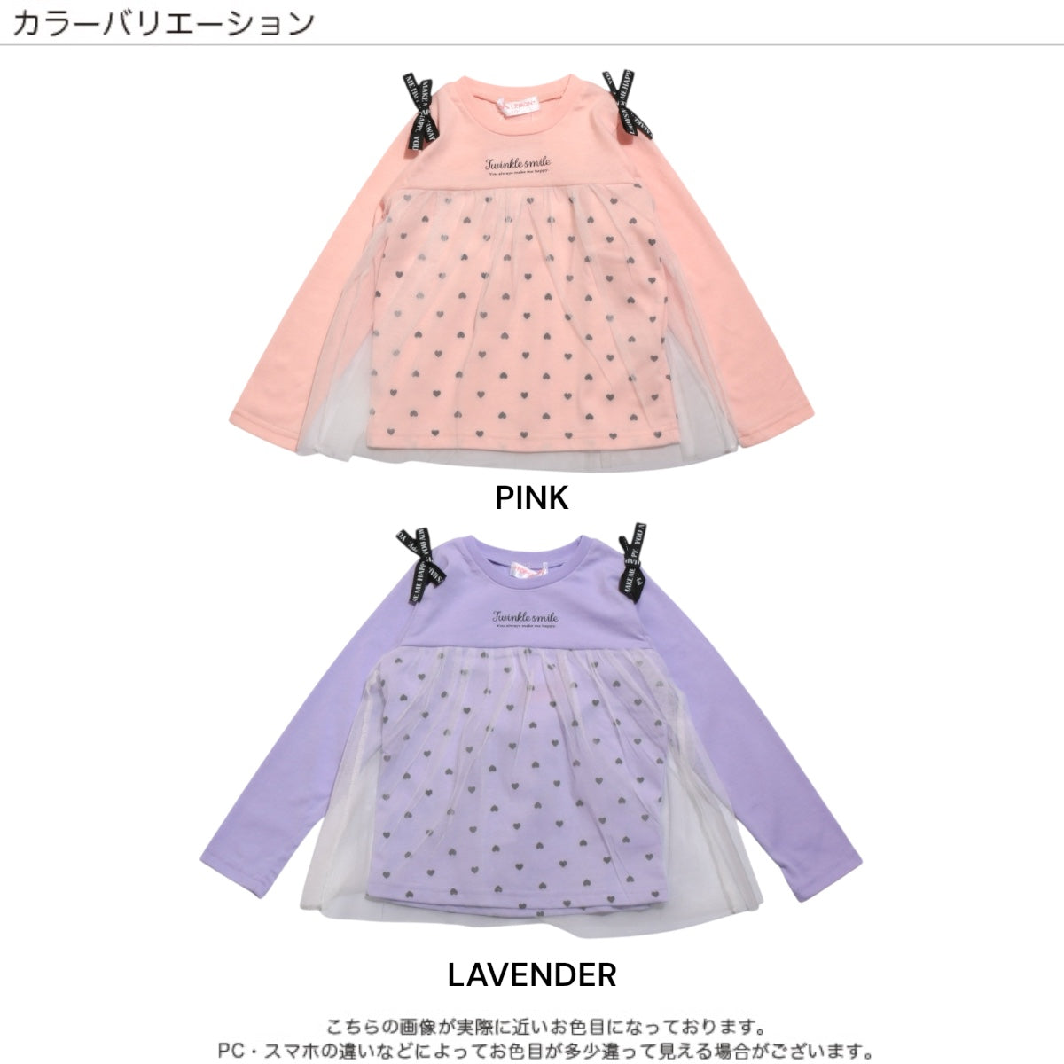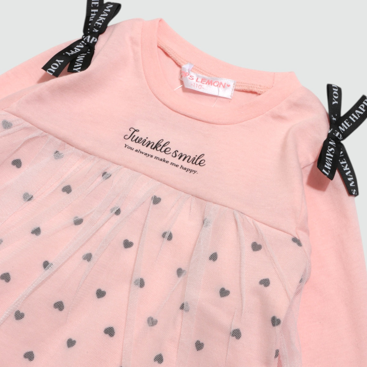 肩のロゴ入りリボンと、ふんわりチュールを重ねた胸からの切替デザインがキュートな長袖カットソーです。 ハート柄の上にチュールがふわっと揺れて、ナチュラルで愛らしい雰囲気に。 身頃部分は天竺の柔らかな素材で、デイリーコーデにも使いやすい。