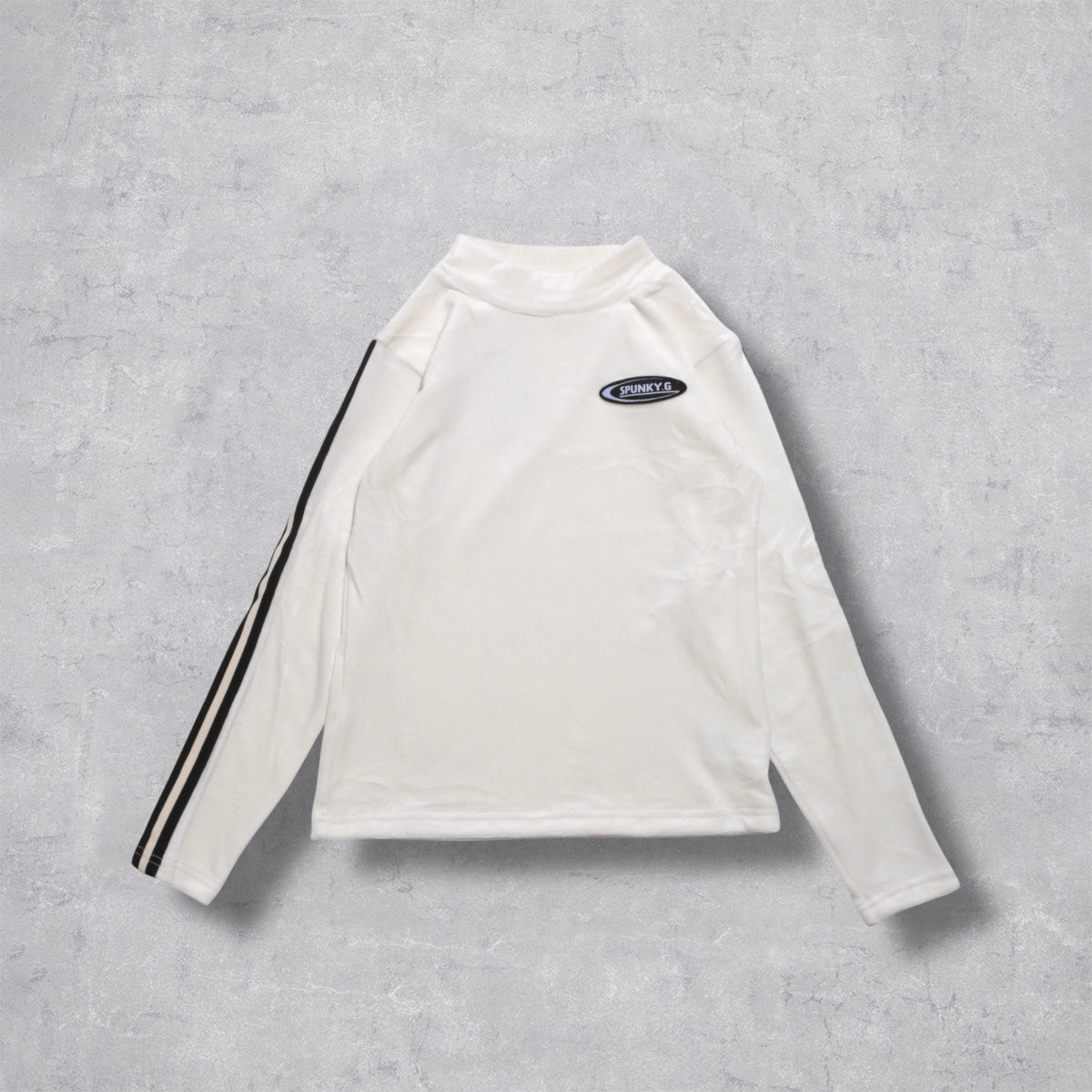 動きやすいストレッチベロア素材のやわらかな風合いのタートルネック。