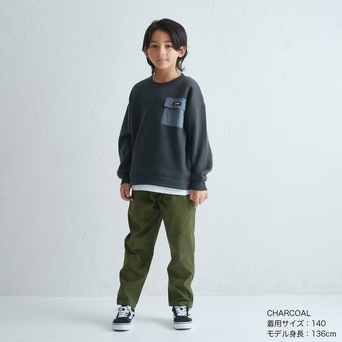 本体:(表側) ポリエステル85%、綿15% (裏側) ポリエステル100% リブ部分:ポリエステル65%、綿30%、ポリウレタン5% ポケット:ナイロン100% 別布:綿100%