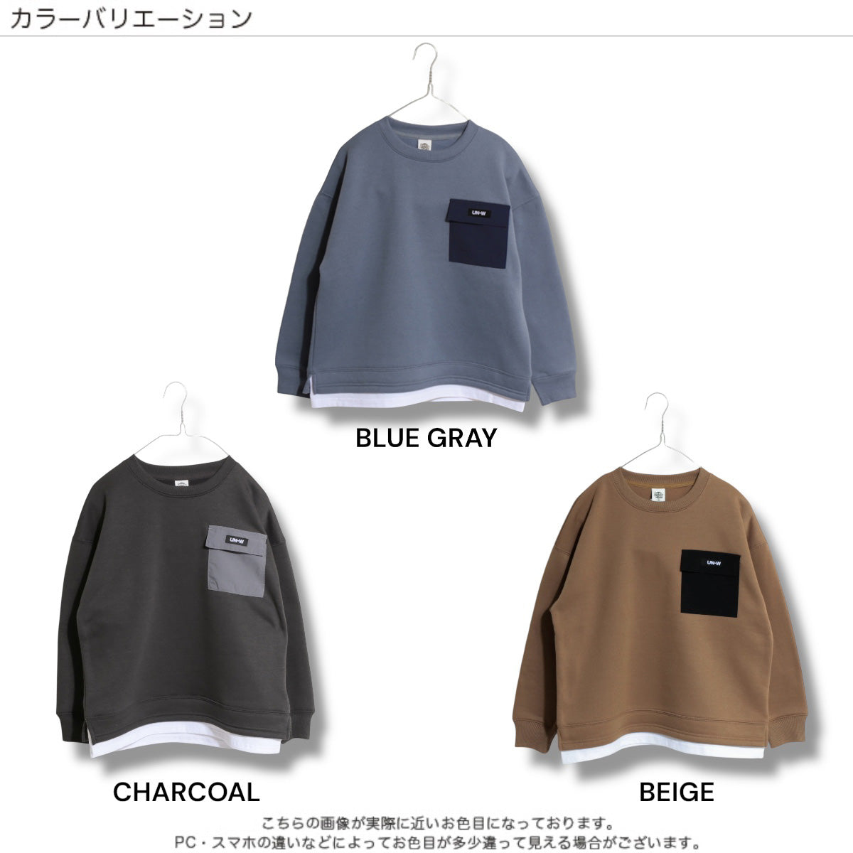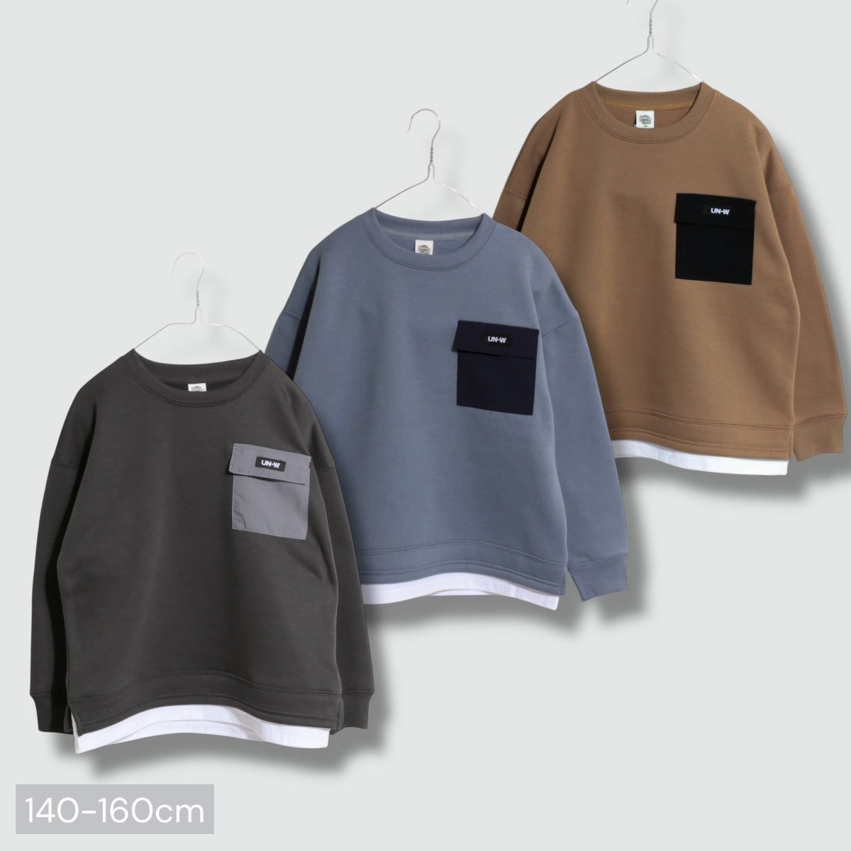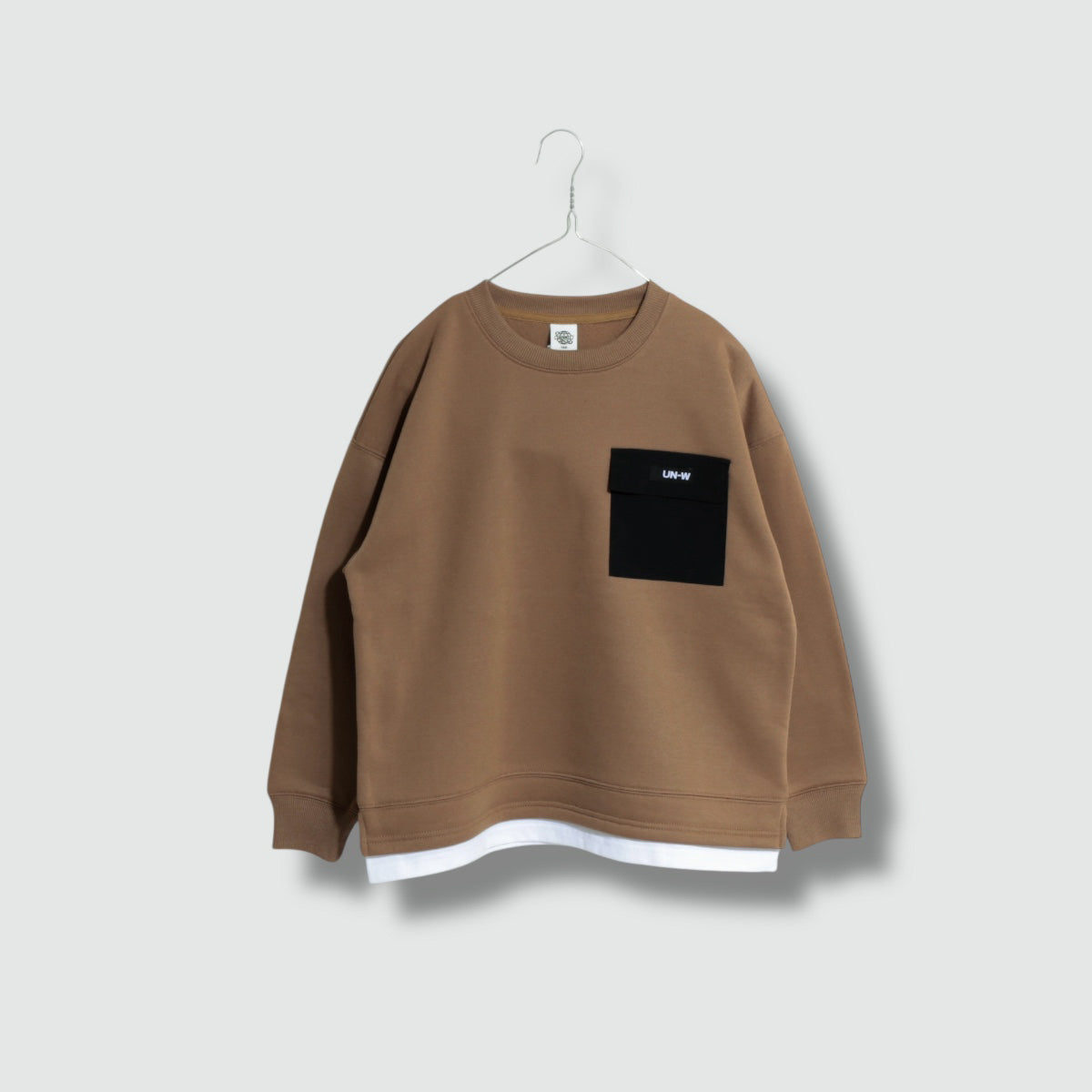 裾フェイクレイヤード 胸ポケット 裏起毛トレーナー